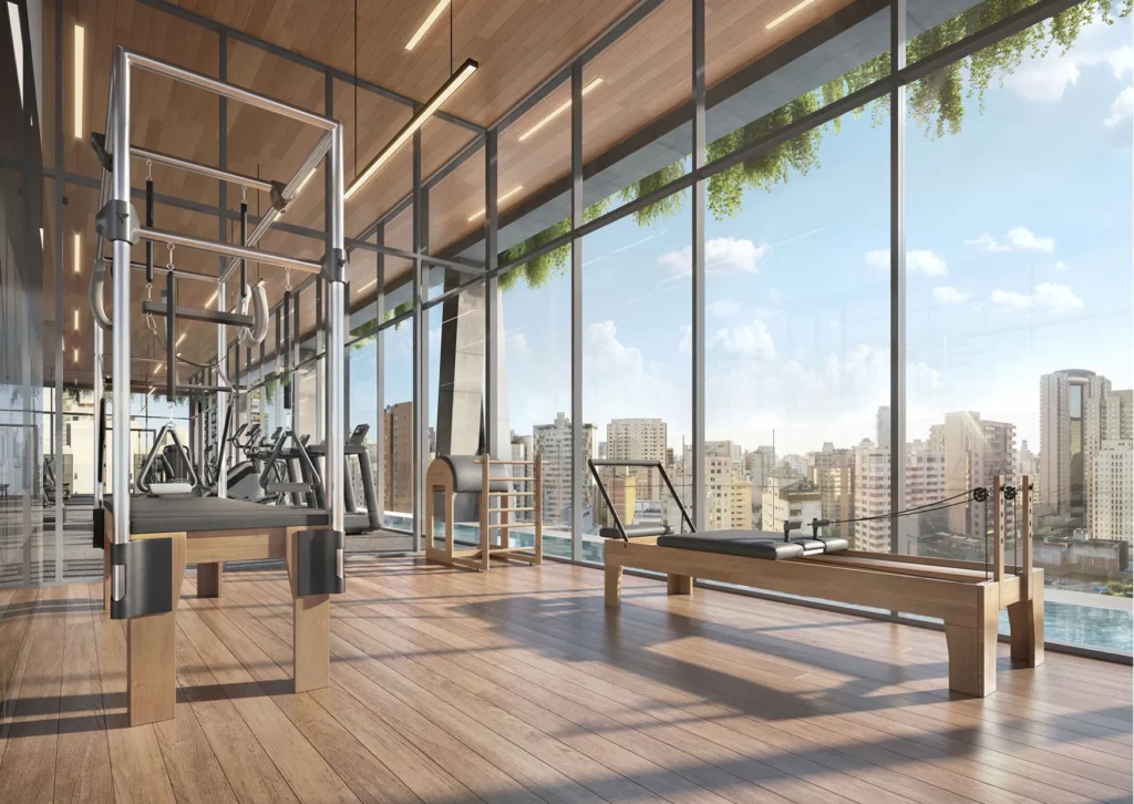 A piscina com borda infinita é um dos grandes destaques do espaço. Além de sua estética refinada, ela oferece uma experiência de relaxamento, com o horizonte aberto e skyline urbano como cenário. Para quem prioriza o bem-estar e a saúde, a academia é equipada com aparelhos modernos, de modo que garante praticidade e eficiência no treino, sem precisar sair de casa.